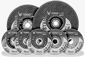 Toroflex 2.0-Produkte sind in den Typen F41, F42 und F27 in Größen von 100 bis 230 mm erhältlich und für den Einsatz auf Winkelschleifern geeignet.