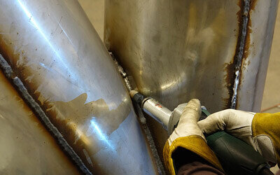 “For example, you would use a knotted wire brush with a heavier wire such as 0.020 in. for cleaning welds because it needs to be aggressive,” he continues. “But to remove light surface contamination from a flat surface on a small part, you may use a 0.006-in. crimp wire wheel on a bench grinder.”