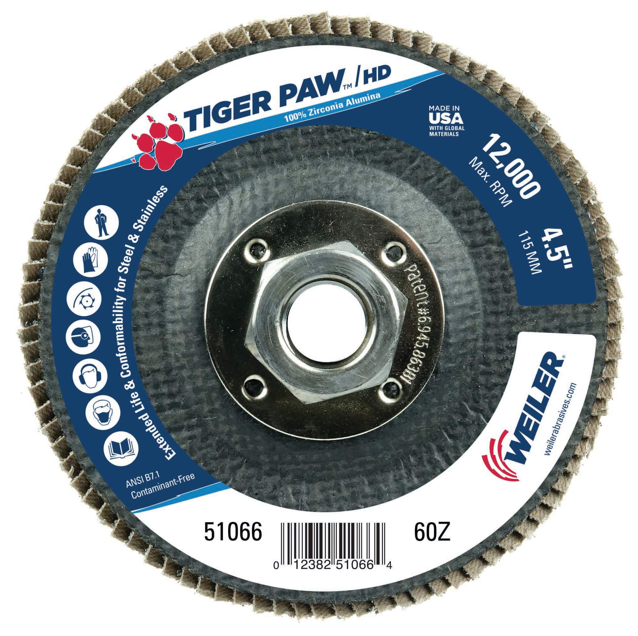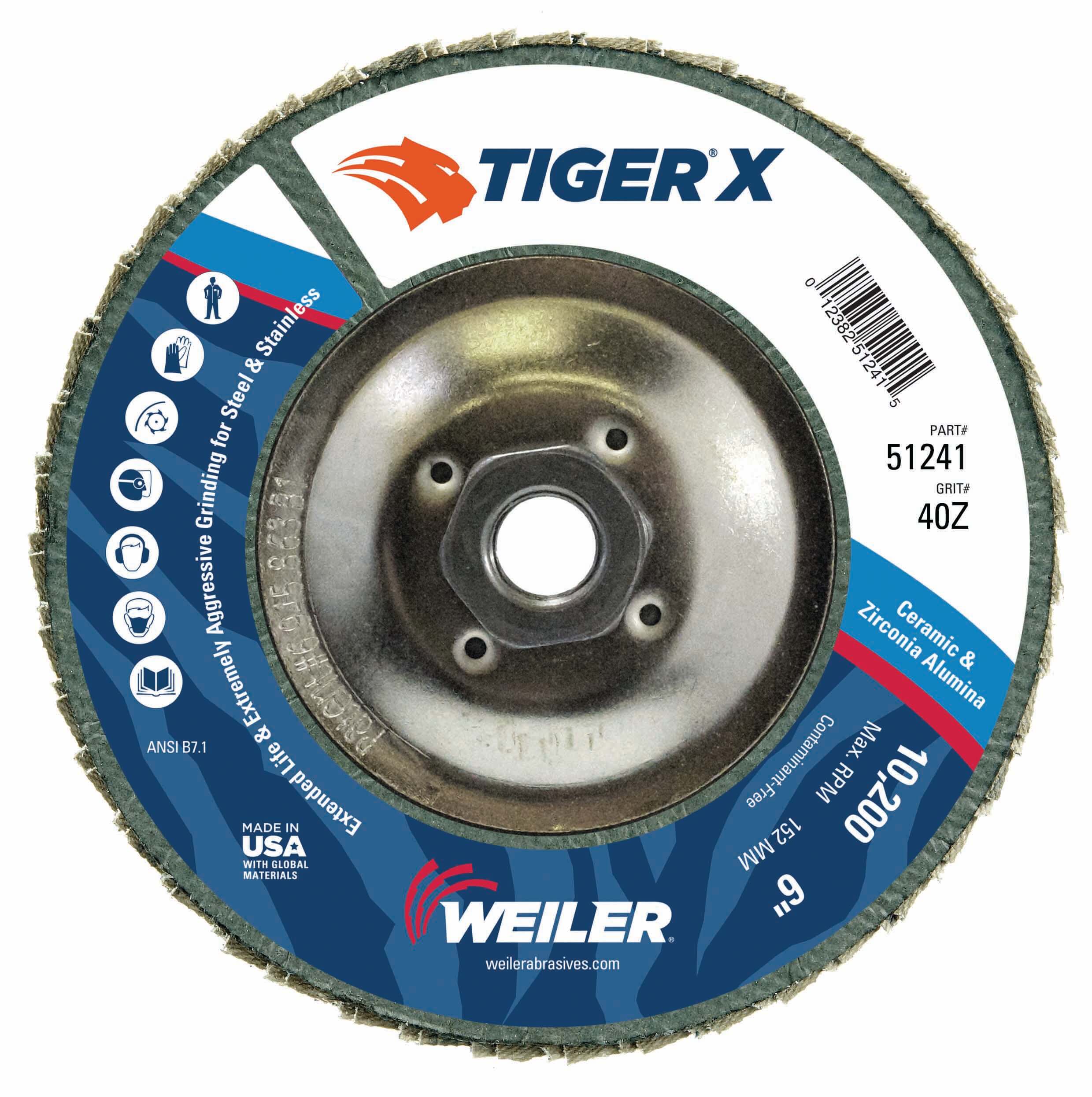 The Tiger Paw™ standard density, 6-inch flap discs are ideal for edge grinding on steel and stainless steel. The 100% zirconia alumina grain holds up to high temperatures and extreme pressure, making them usable in heavy-duty applications. Tiger Paw flap discs are also available in high-density designs for conforming to irregular surfaces. Weiler Abrasives offers the high-density Tiger Paw in a 4.5-inch, conical style (Type 29), as well as 5- and 6-inch flat style (Type 27).